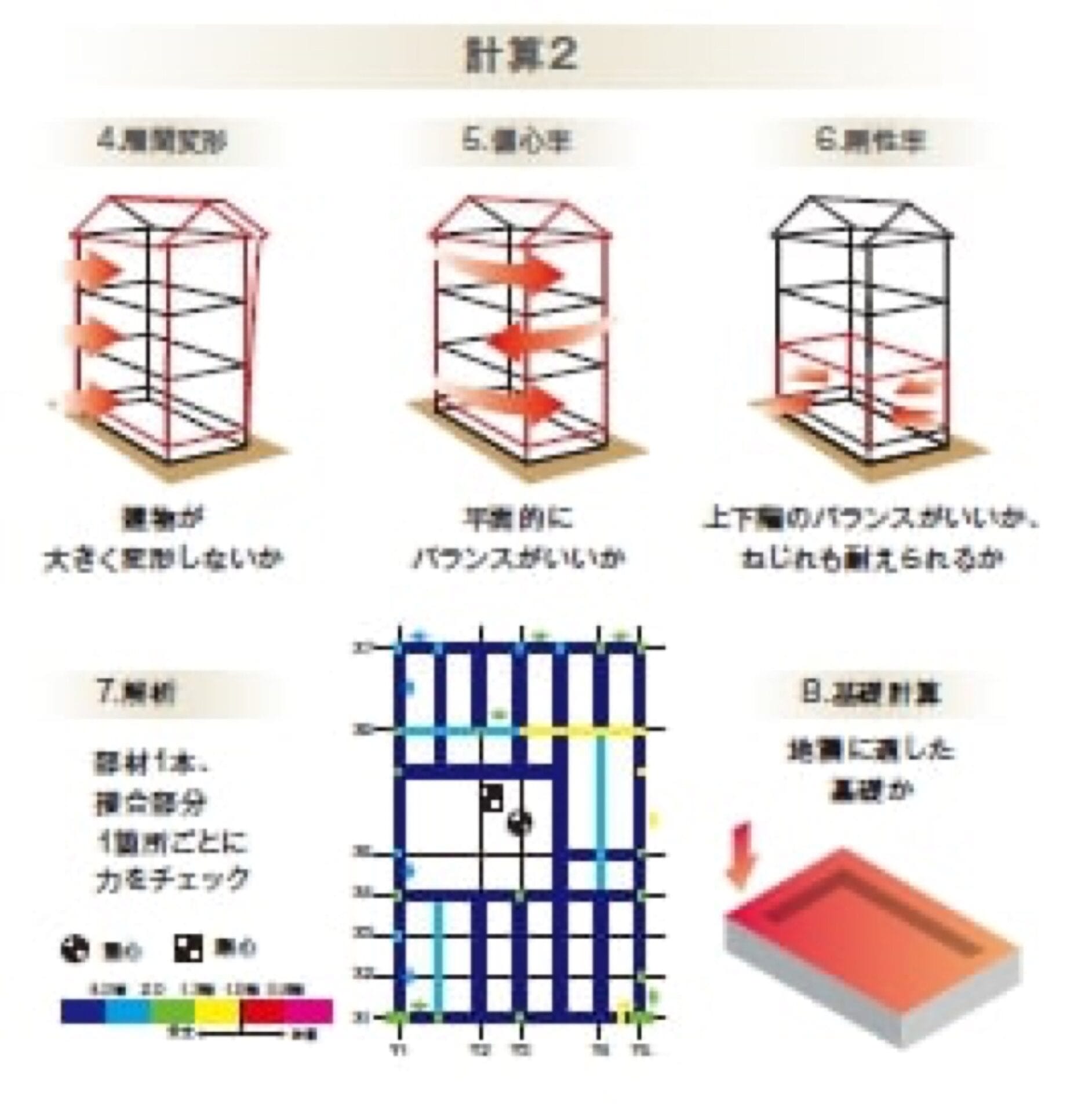 「仕様規定」はその建物に必要な壁量と壁配置のバランス・柱頭・柱脚の接合を計算する最低限の仕様で、その次が「性能表示計算」、もっとも厳密なのが「構造計算」です。「許容応力度計算」とは構造計算の一種です。