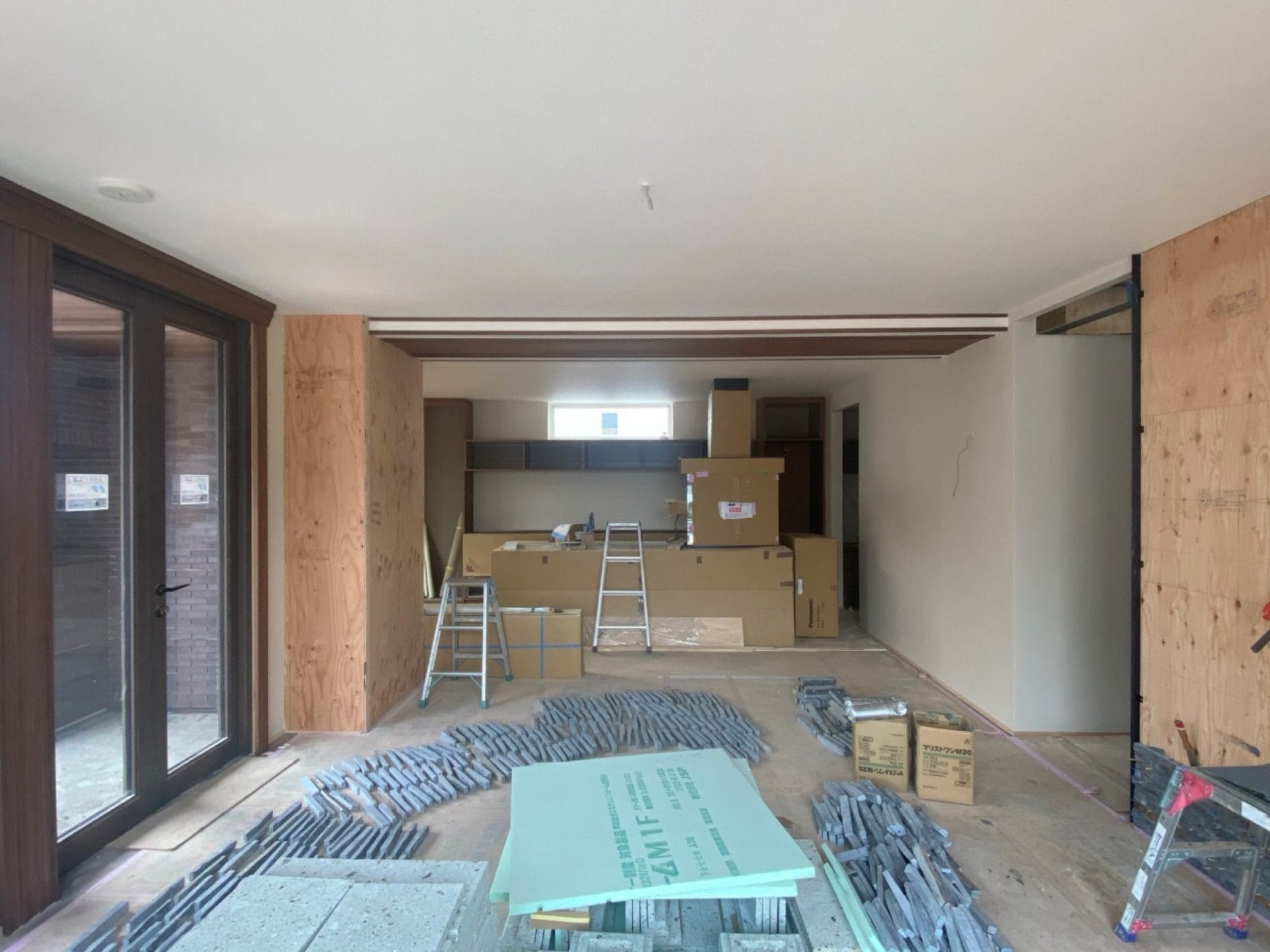 LDKです。室内のタイルが納品されて、前回ご紹介したときよりもずっとお部屋らしくなりました。オンリーワンの設計の家を、1カ月でこんなに進めるなんて、やっぱり当社の職人さんはすごいです!