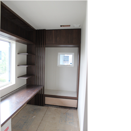 小窓がついたこのスペースは書斎のようです。シンプルな造りつけの棚が便利そうですね。