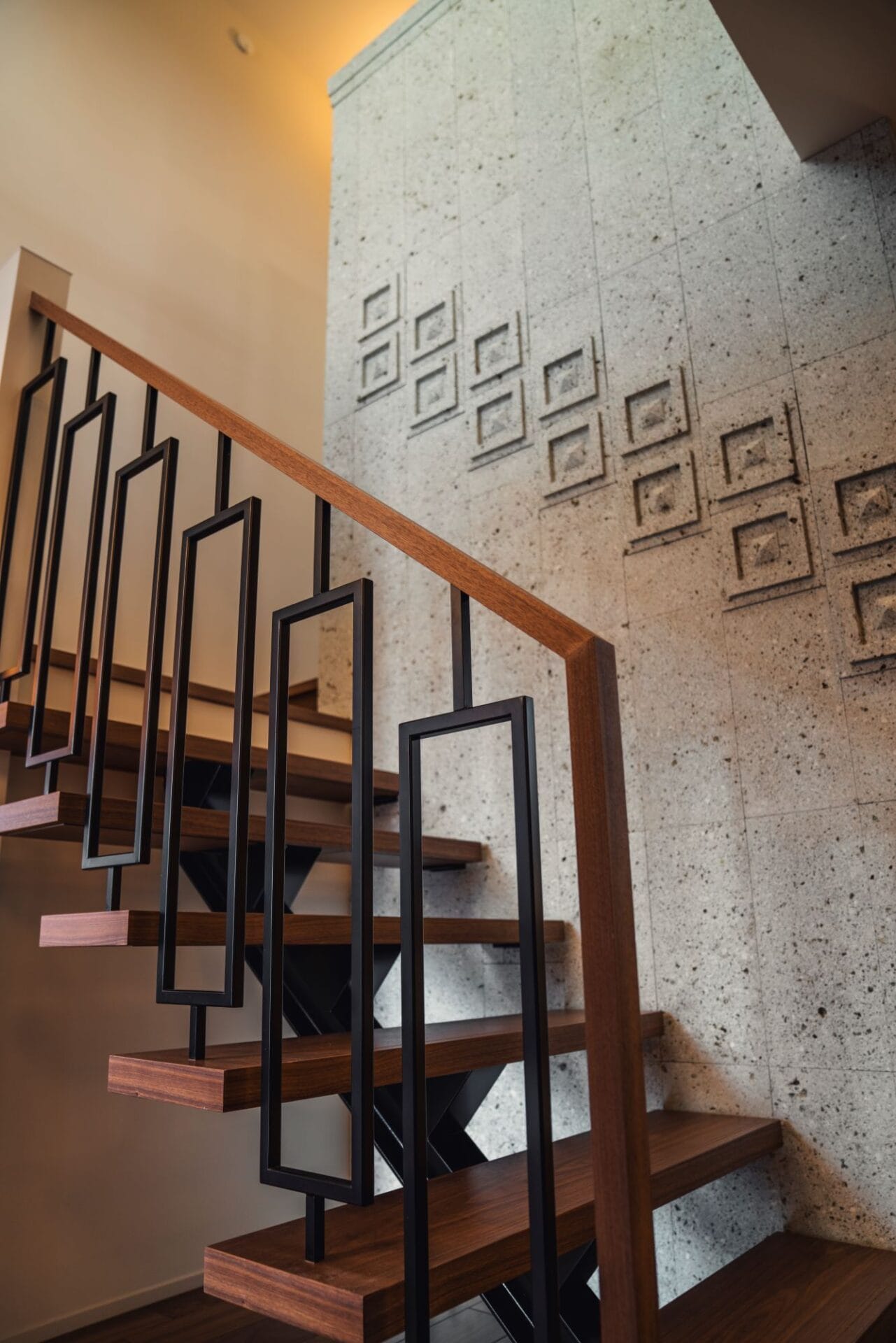 大谷石の壁とアイアンの手すりがかっこいい、空間のシンボルのような、インテリアにもなる階段です。