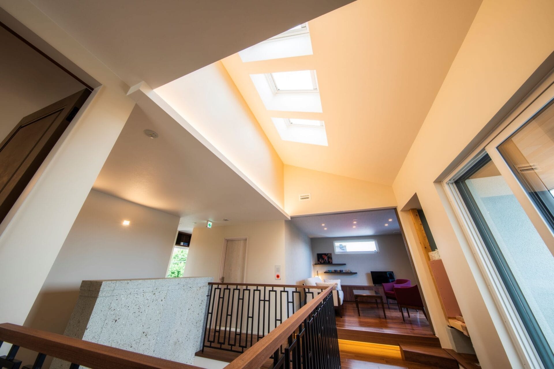 大きく開いたトップライトからお日さまの光が降り注ぎ、2階はもちろん1階のホールまで明るく照らしてくれます。
