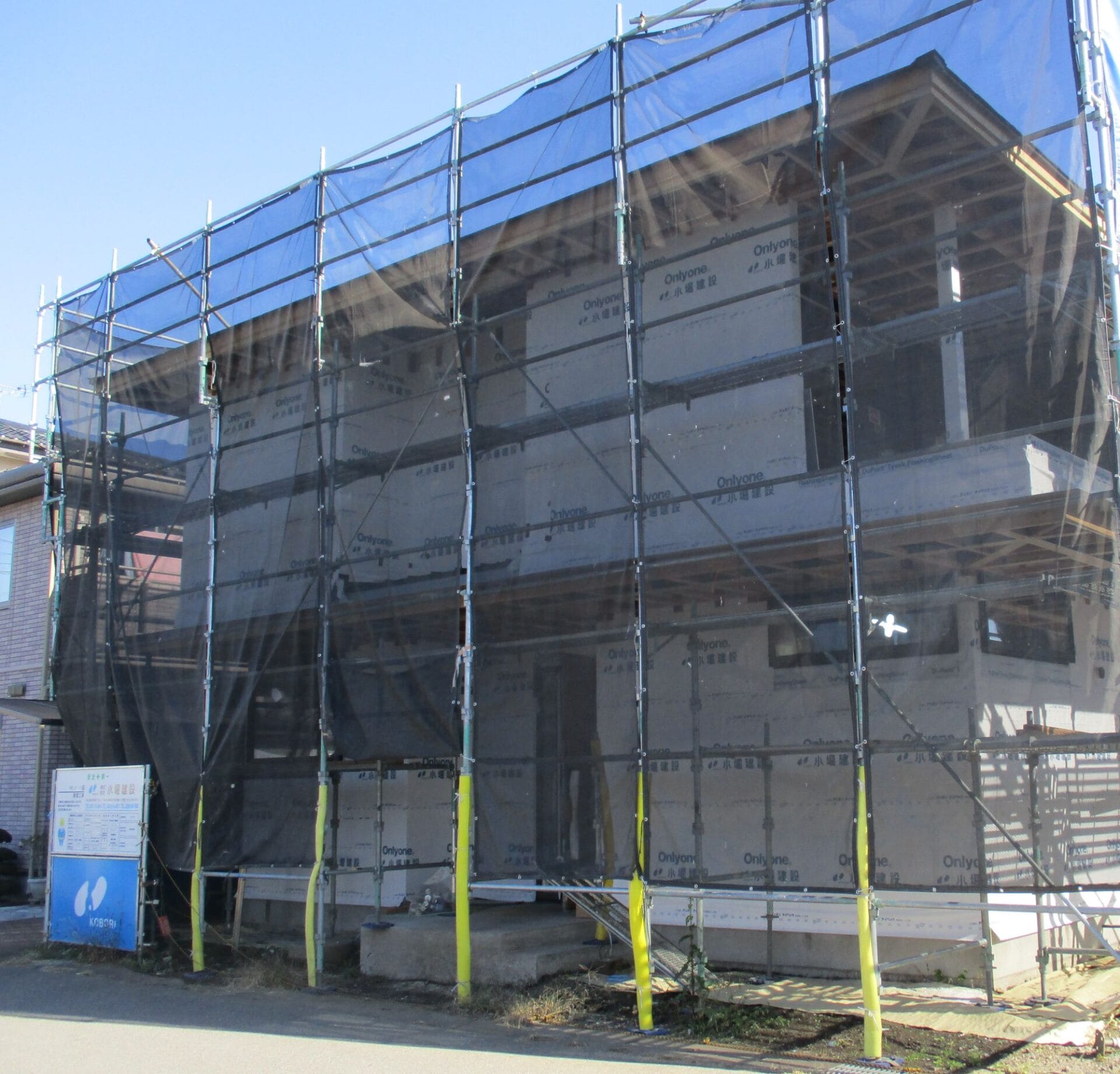 まずは外観から。まだ足場があるので見えにくいですが、玄関が確認できますね。