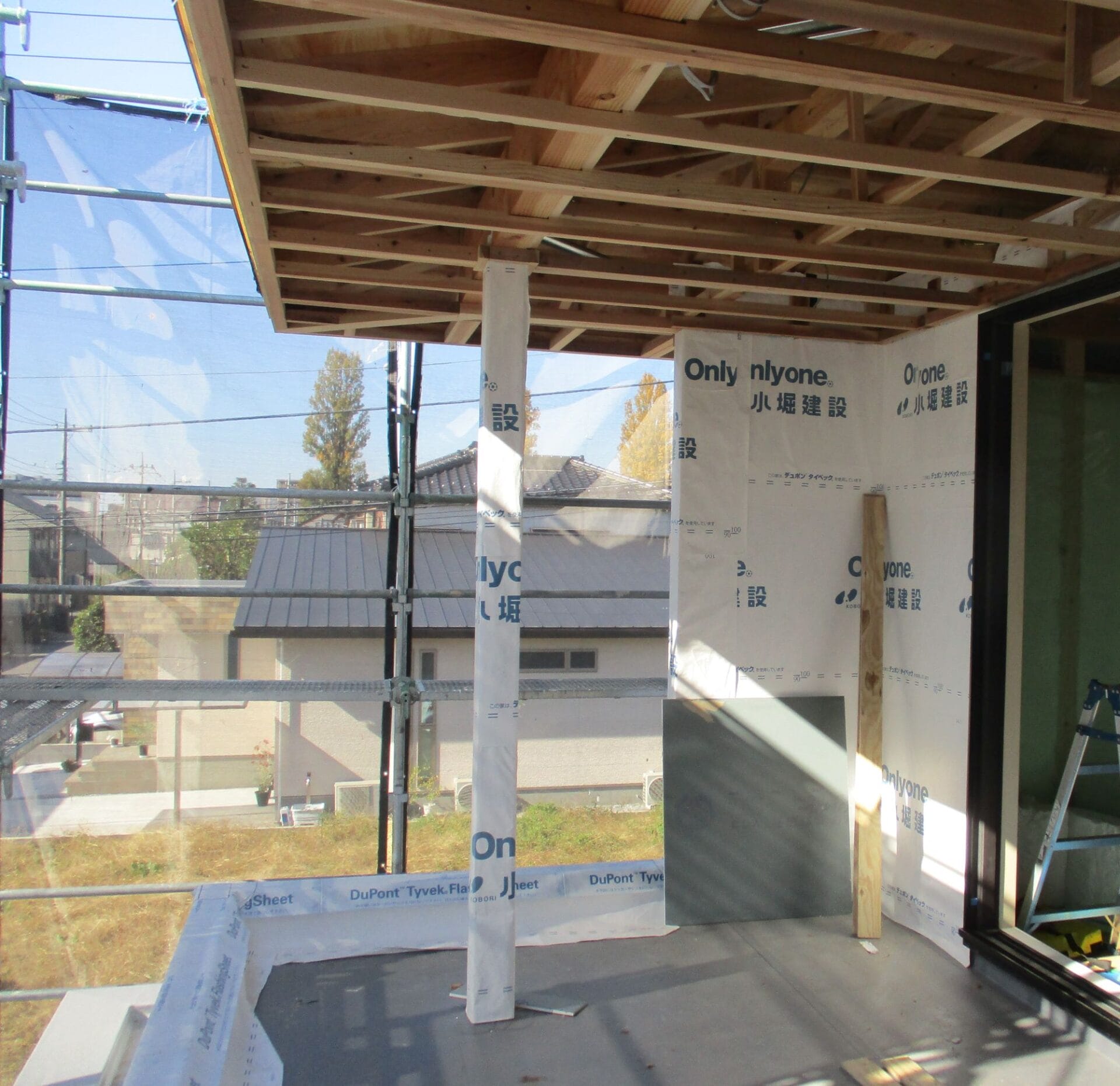 軒を支える柱が全体のアクセントになっていますね。シートが取れるのが楽しみです!