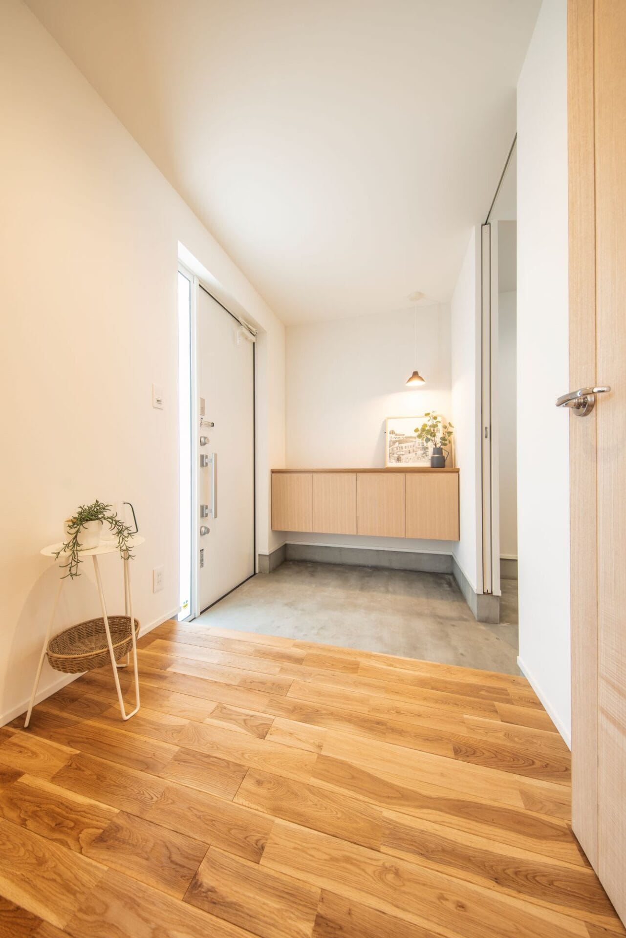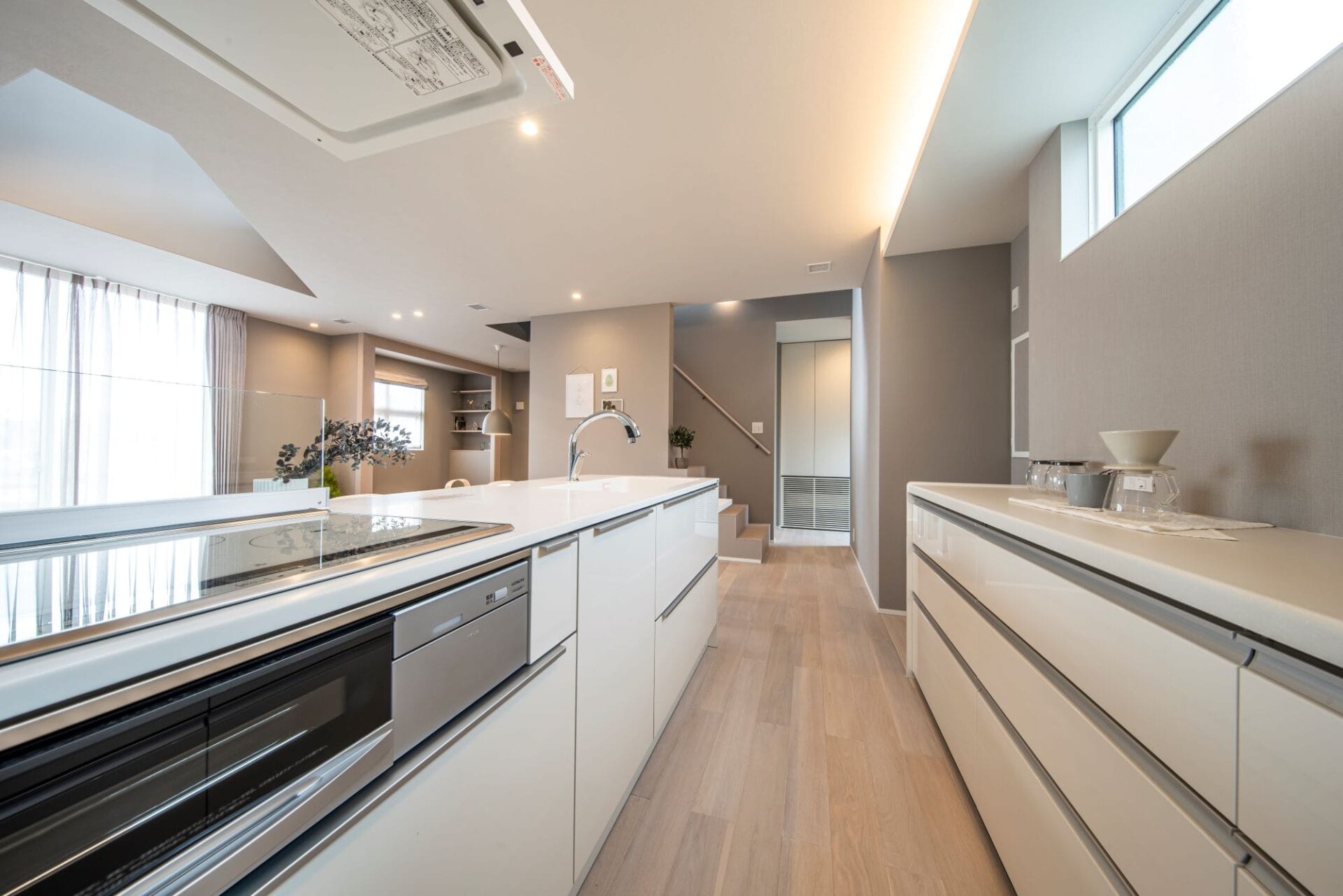 玄関土間からシューズクローク併設の家族玄関を通り、パントリーを抜けてキッチンに入る動線。荷物の運び入れ、運び出しがラクラクです。
