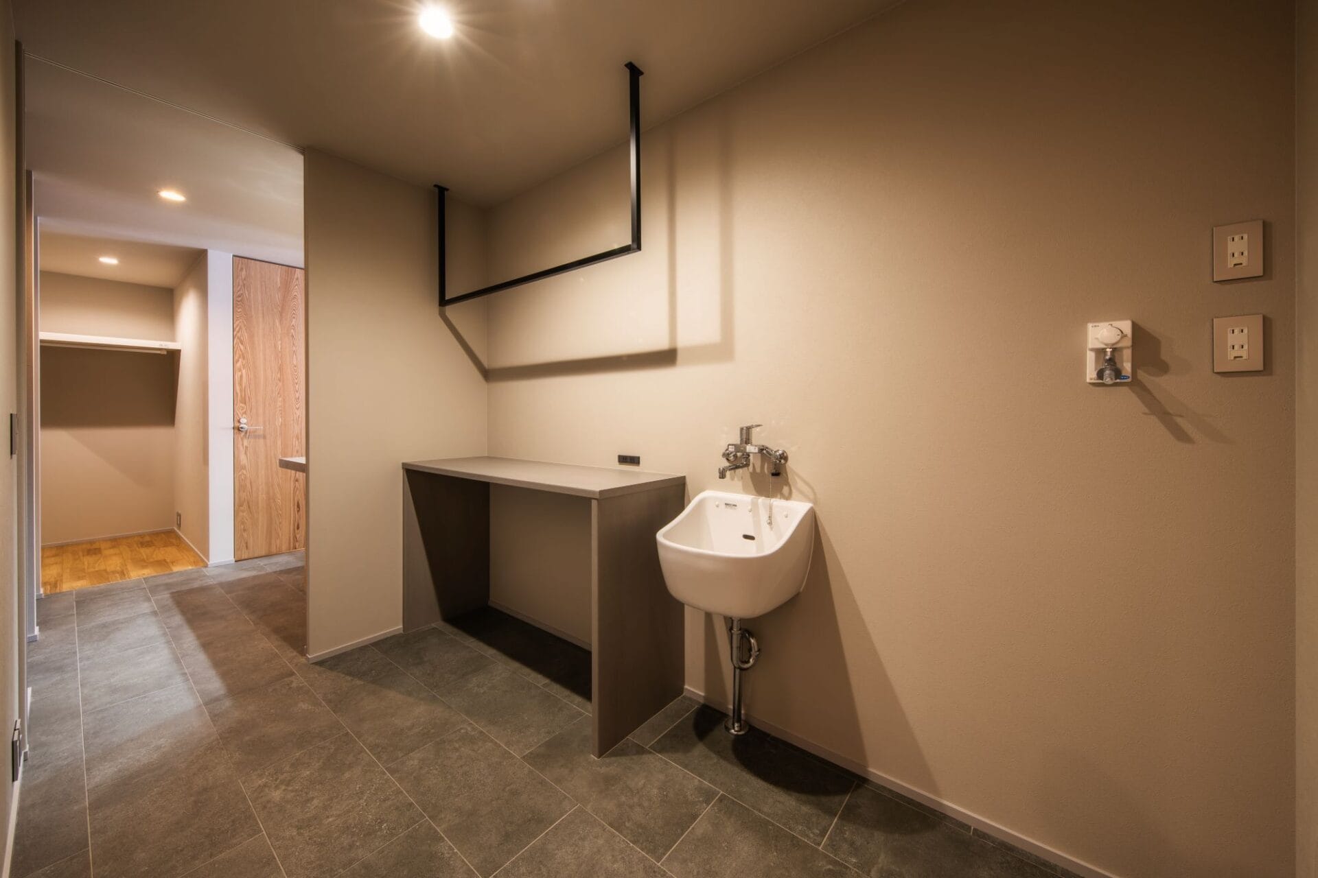 ランドリールームに作業台を設置すれば、洗濯物をたたむ場所としてだけでなくアイロン台としても使用可能。アイロン台を別で用意する必要がなく、収納にも困りません。