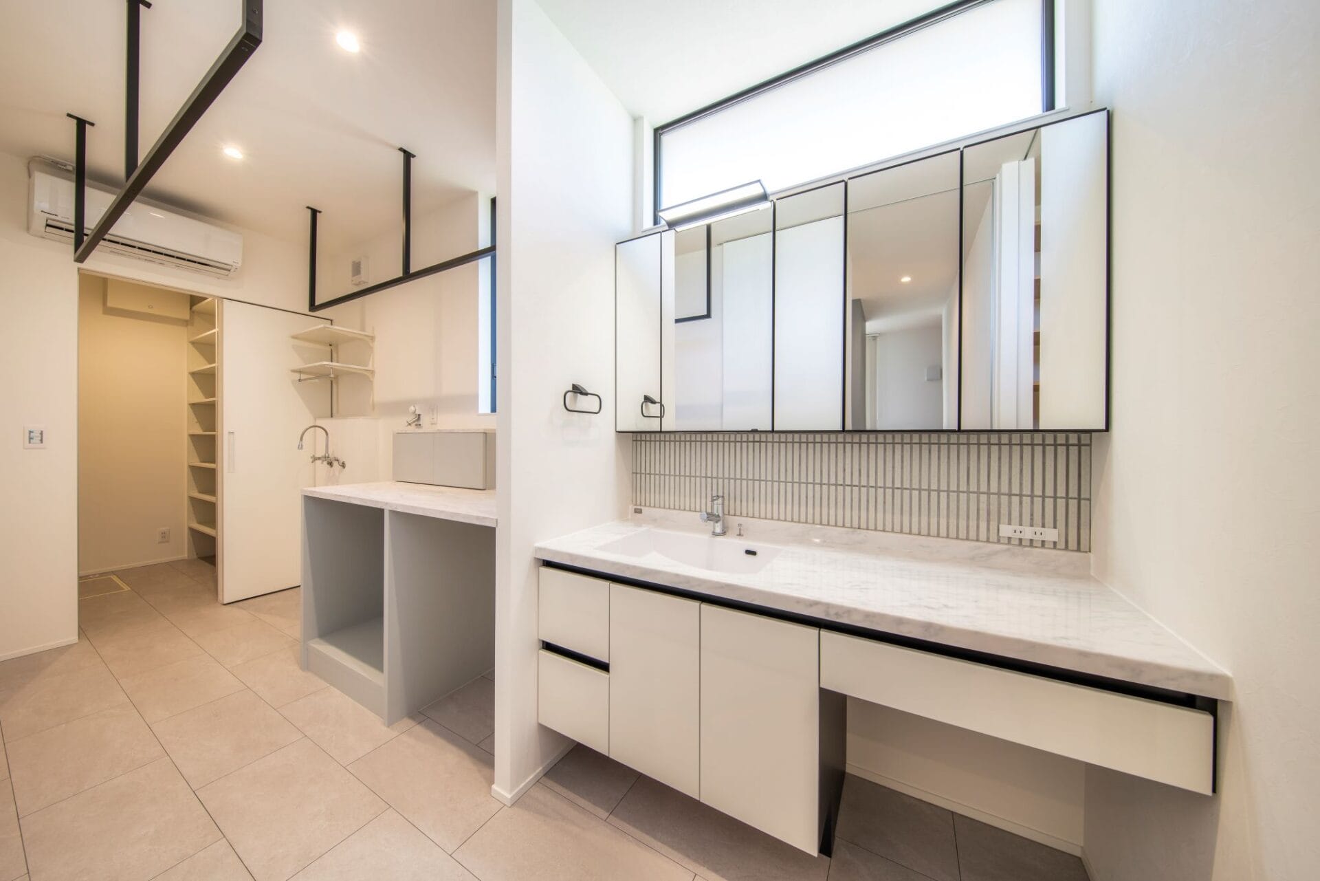 また、天井にアイアンバーを取りつけたり、物干しスタンドを置く広さを設けたりすれば、室内干しスペースとしても使えます。