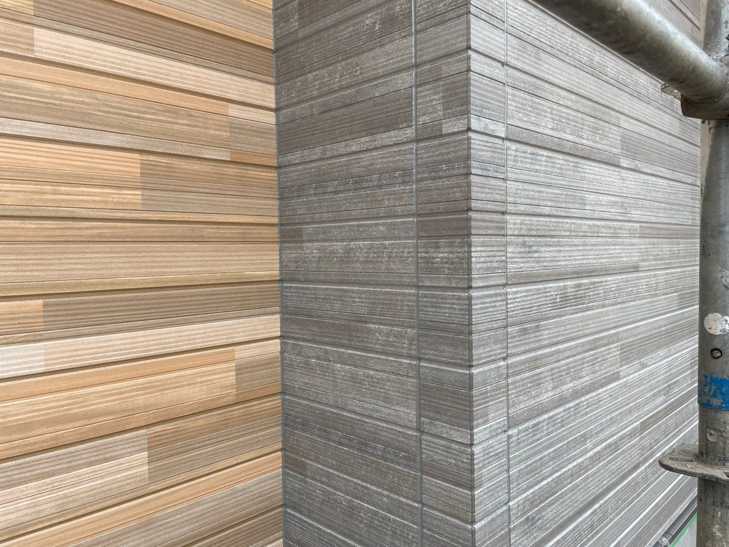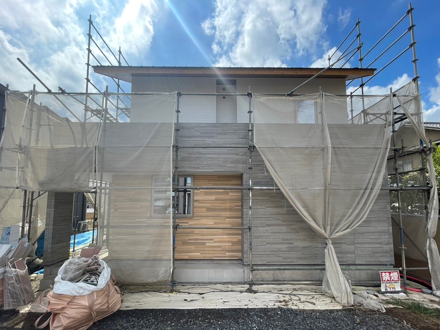 足場があるのでまだ見にくいですが、こちらは北側から見た様子です。軒が深く出て、高級感のある佇まいですね。木目調の軒天がおしゃれです!