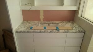 石カウンターも付け始めました。上はアラベスカート。下はタソスホワイトです。最近はメンテナンスが楽な人工大理石が主流ですが、やっぱり自然素材は良いですね。