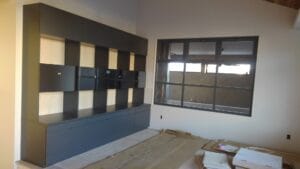 室内足場が撤去されたので家具取付再開です。こちらは打合せスペースのディスプレー家具です。2列目4列目の合板の所はストーンシートと言う天然石を薄くスライスしシート状にしたものを貼ります。中央はグレーミラーでアクセントにして上下配色をシンメトリーなデザインになっています。家具色も右の建具色と合わせました。また床はグレーのナイロンカーペットを貼ります。色コーディネートがばっちり合っています。カーペット施工が楽しみです。