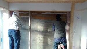 玄関の版築が終わり次は床の間の版築です。女性の職人さんが塗っていました。ここは楽しみなところの一つです。