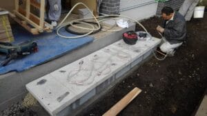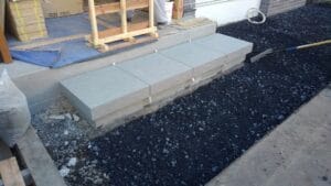 ポーチに上がるステップです。夜でも安全にご利用いただけるようにステップ廻りを間接照明にします。テープライトを付けています。