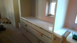 石カウンターも付け始めました。上はアラベスカート。下はタソスホワイトです。最近はメンテナンスが楽な人工大理石が主流ですが、やっぱり自然素材は良いですね。