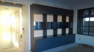 室内足場が撤去されたので家具取付再開です。こちらは打合せスペースのディスプレー家具です。2列目4列目の合板の所はストーンシートと言う天然石を薄くスライスしシート状にしたものを貼ります。中央はグレーミラーでアクセントにして上下配色をシンメトリーなデザインになっています。家具色も右の建具色と合わせました。また床はグレーのナイロンカーペットを貼ります。色コーディネートがばっちり合っています。カーペット施工が楽しみです。