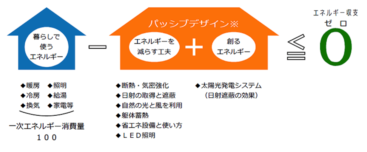 断熱化や高効率設備で省エネし、加えて太陽光発電などで創エネすることで、家庭のエネルギー消費量をプラスマイナスゼロにする、というわけです。