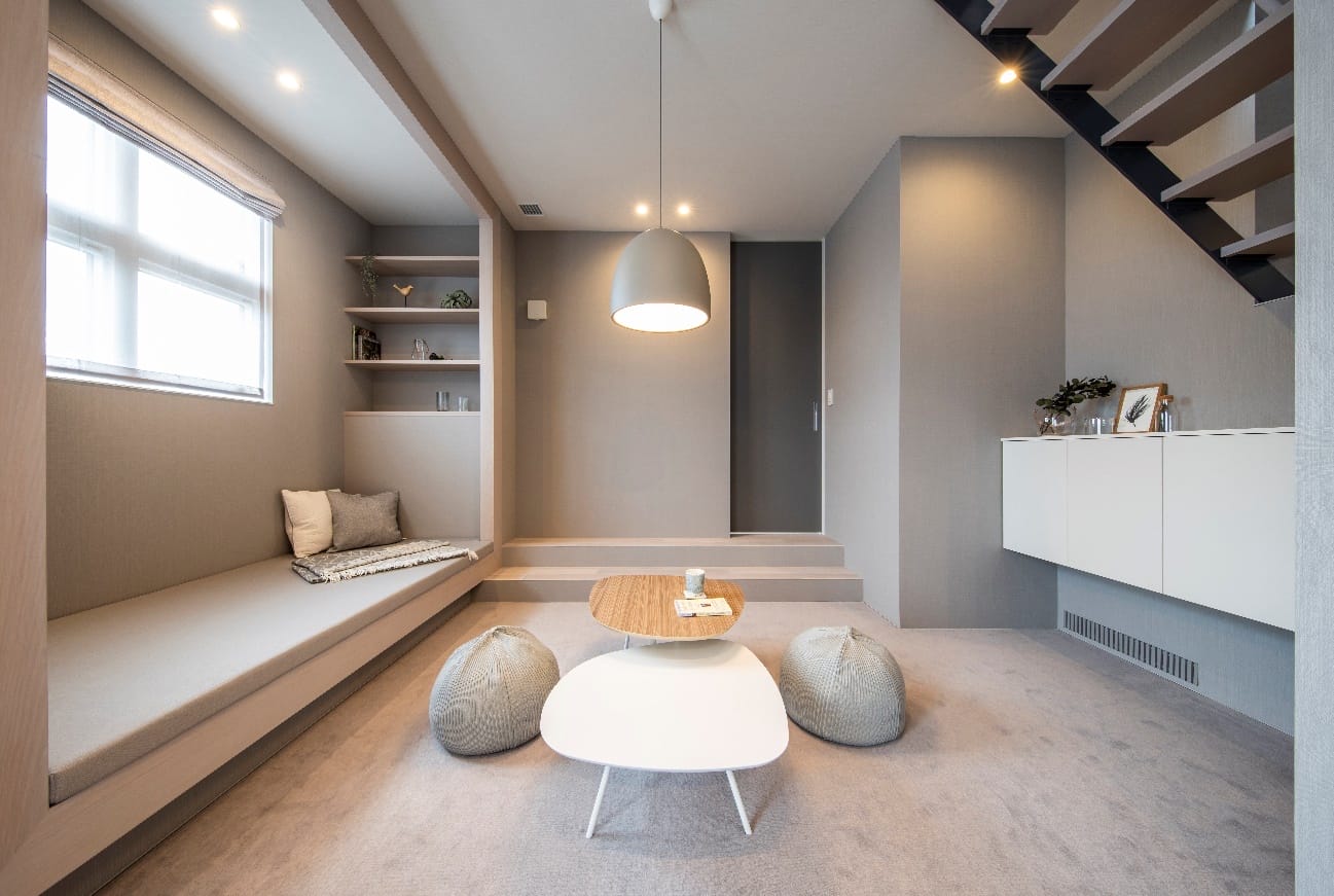 テーマカラーのグレーに包まれた内観は不思議と温かみがあり、優しい雰囲気です。