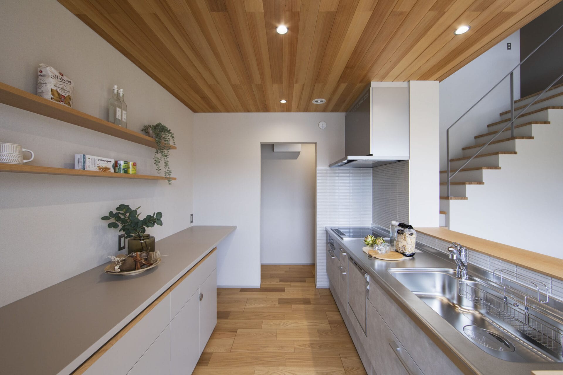 木目調の天井がナチュラルな雰囲気のキッチン。インテリアにもなる見せる収納棚がおしゃれです♪お気に入りのカップやスパイスのビンなど、ただ使うだけじゃもったいないかわいいモノを飾りながら収納できるって、いいですよね^^