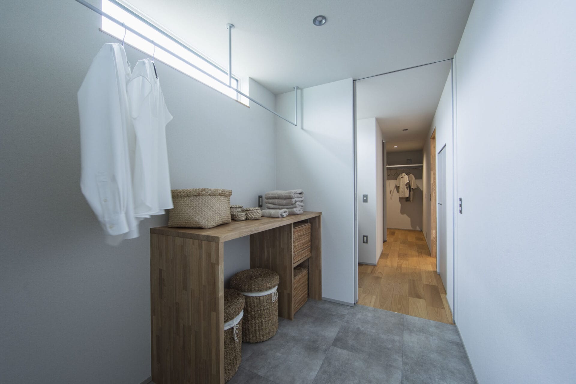 家事効率のよい生活動線も見どころポイントのひとつ。ご見学にいらしたら、「バスルーム~ランドリールーム~ファミリークローゼット」のまっすぐな動線をぜひ実際に家事をしているつもりで移動してみてください!動きに無駄がなくて、実にスムーズ。
