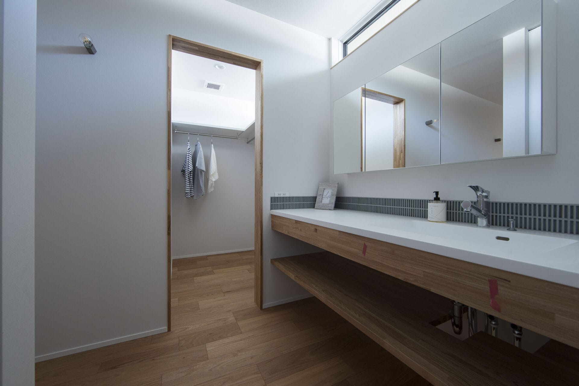 間取りの北東側にファミリークローゼット、洗面台、トイレ、ランドリールーム兼脱衣室をまとめました。朝の忙しい時間の支度が手際よく行えるよう、コンパクトな動線を意識しています。