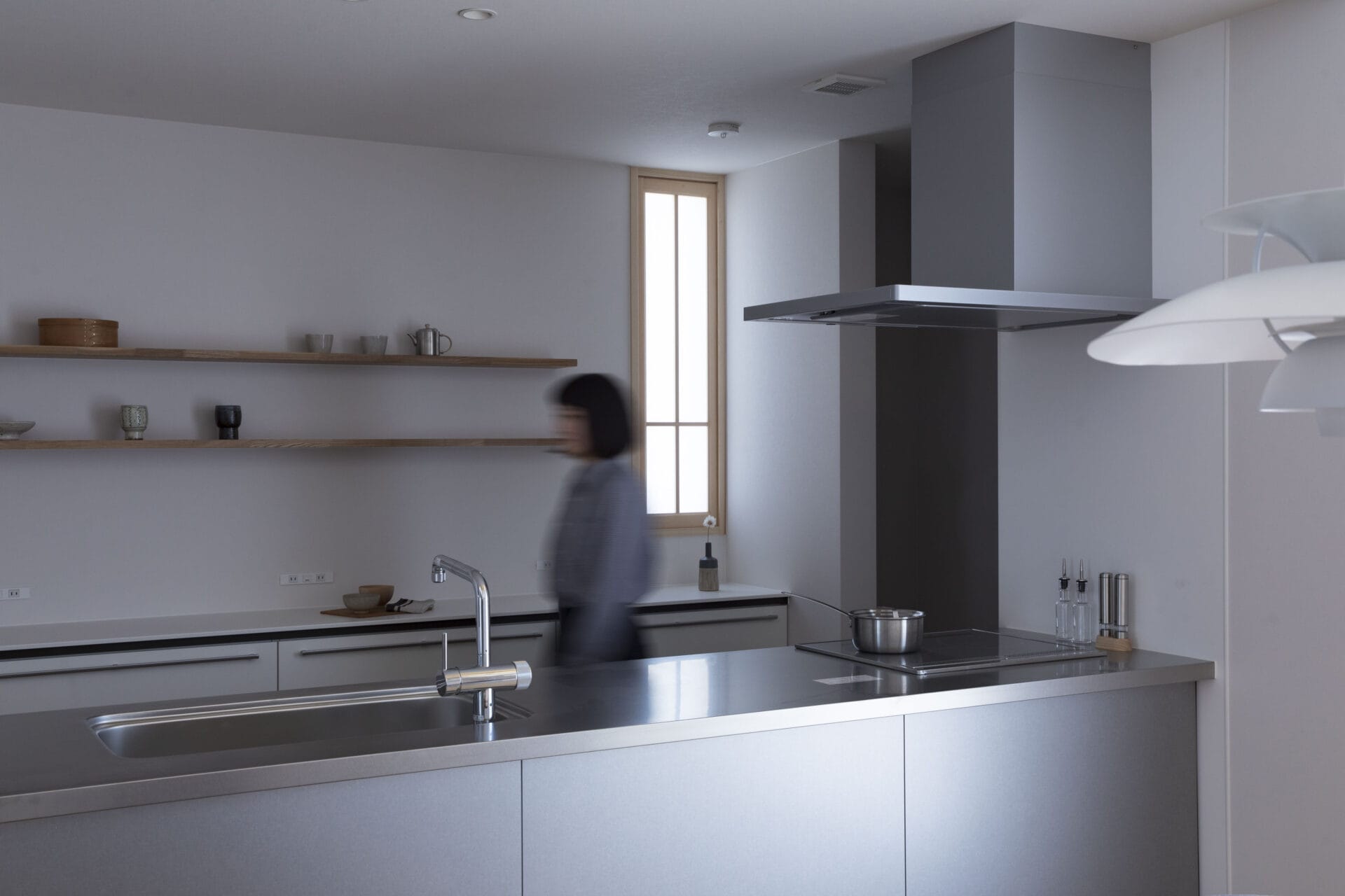 「灯影の家」が建つ土地は国道近くのために車の往来が多いのですが、その方角に背の高い植栽を配置して視線を柔らかくカット。それでもダイニングの位置からはわずかに国道が目に入るため、もっともくつろいでいただきたいリビングは北側に離して配置しました。