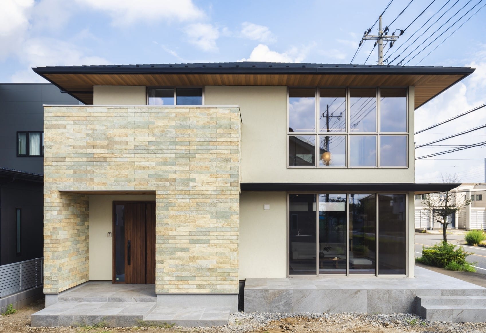 深い軒と美しく配置された外壁の組み合わせがきれいな外観。大きな窓が印象的で、重厚感のある佇まいです。
