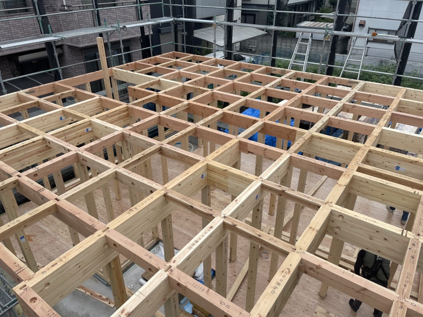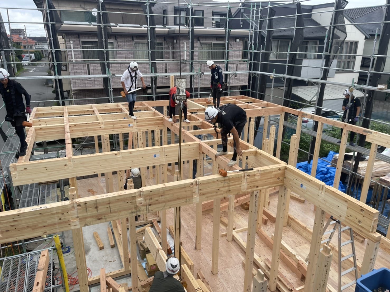 通常1日で終わらせる作業なので、大工さん総出で行います!建材がたくさん運ばれて、人もたくさんいるので、家の建築工程の中でもとても見ごたえのある作業です。