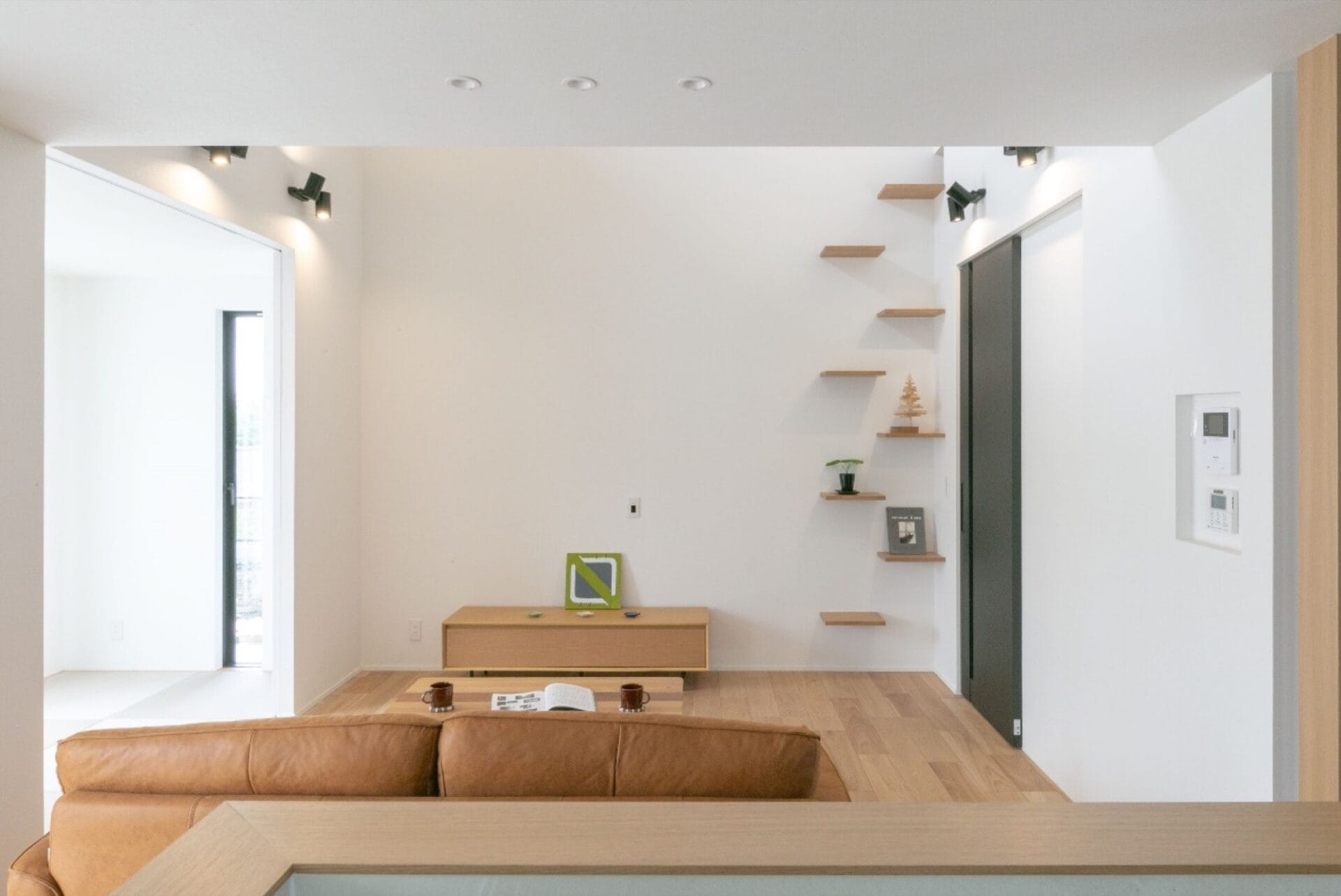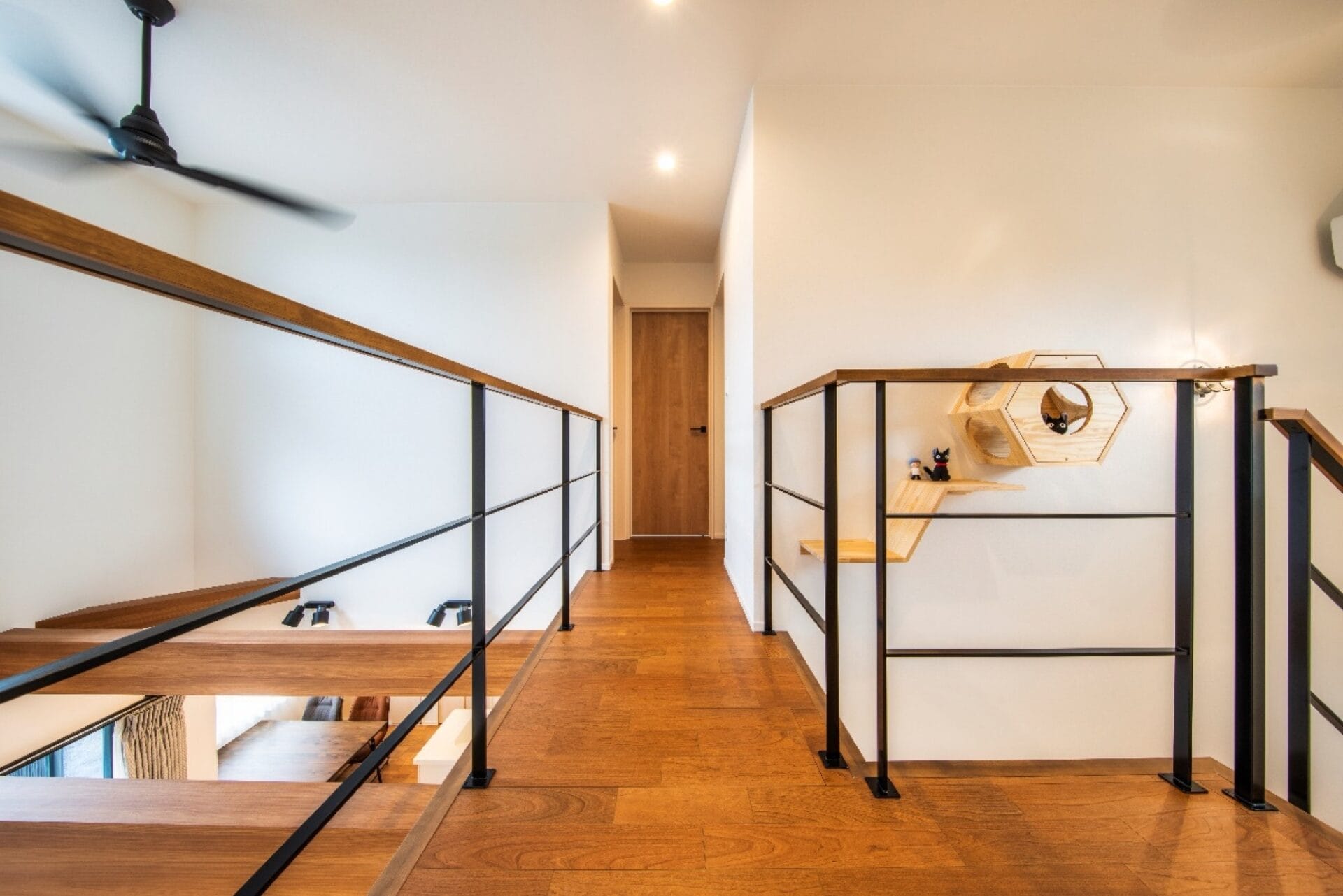 こちらのお宅は、2階廊下の壁にネコちゃんが遊んだり休んだりできる棚を造りつけました。