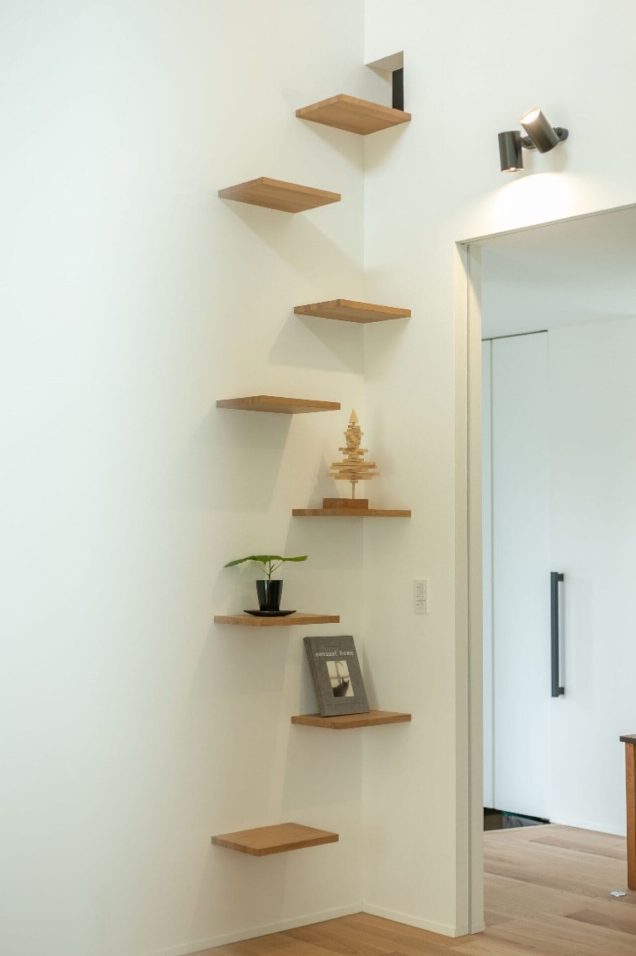 どちらかおわかりでしょうか…… そう、壁にステップのように取りつけられた棚です!