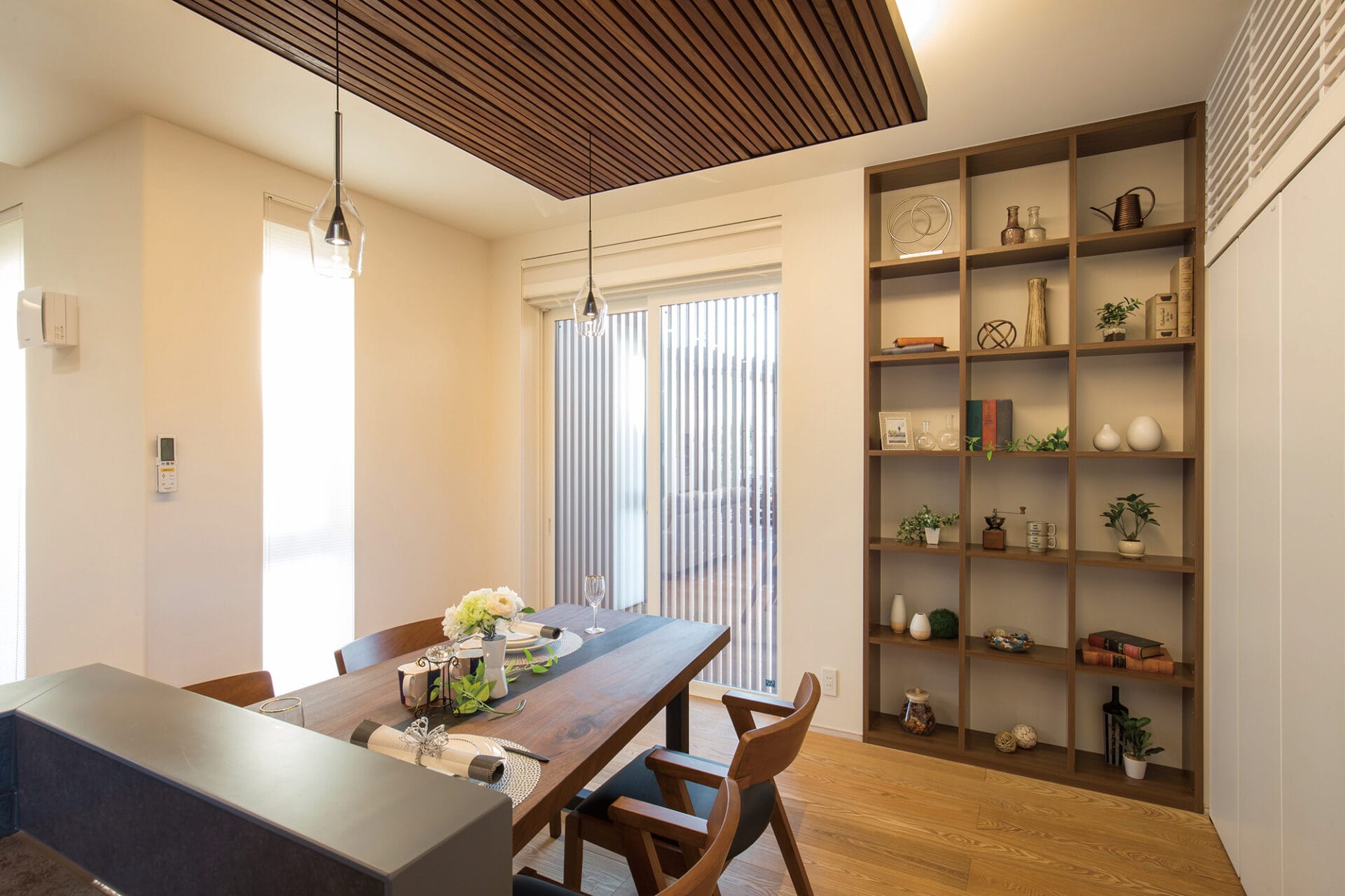 近くに大きな棚をつくり、読書中の本や学習グッズをしまうことができます。ダイニング学習にぴったりですね。