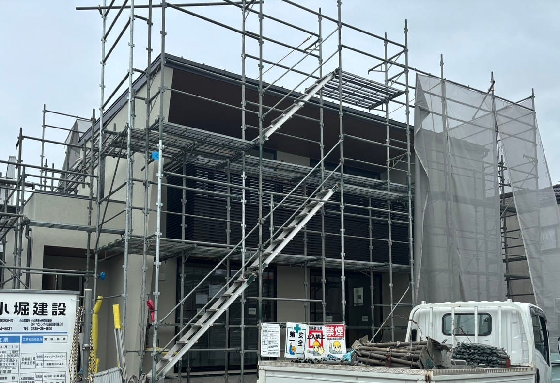まだ足場がありますが、外観がだんだん見えてきました!グレーと黒のシックな装い。落ち着いた雰囲気がすてきです^^ 足場がとれるのが楽しみですね。