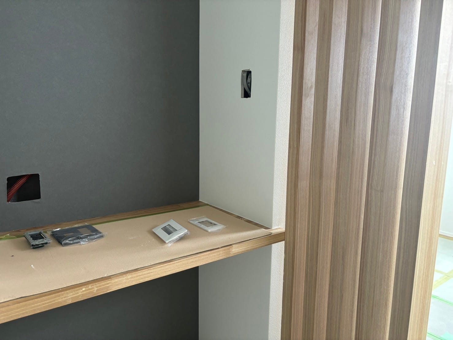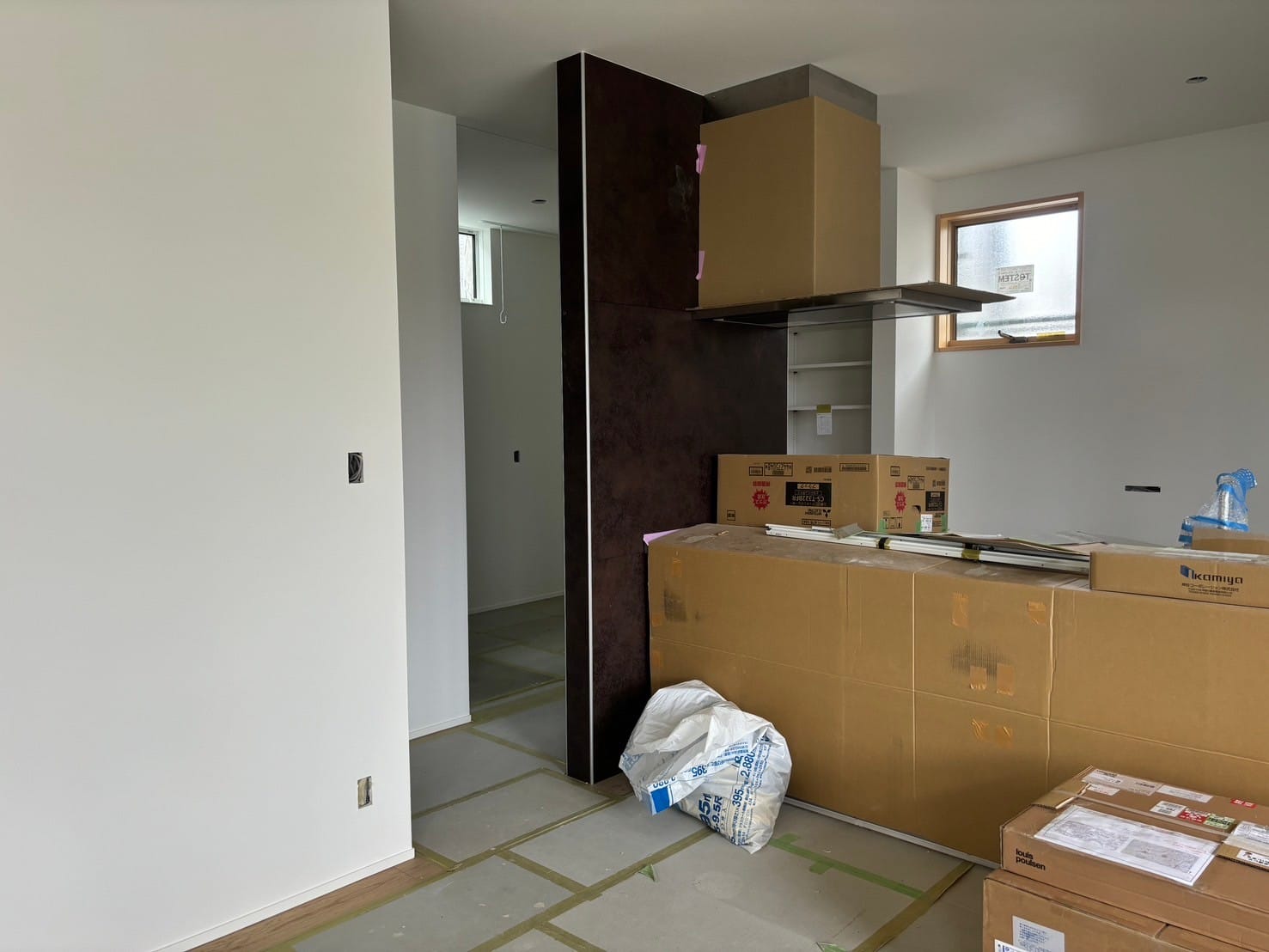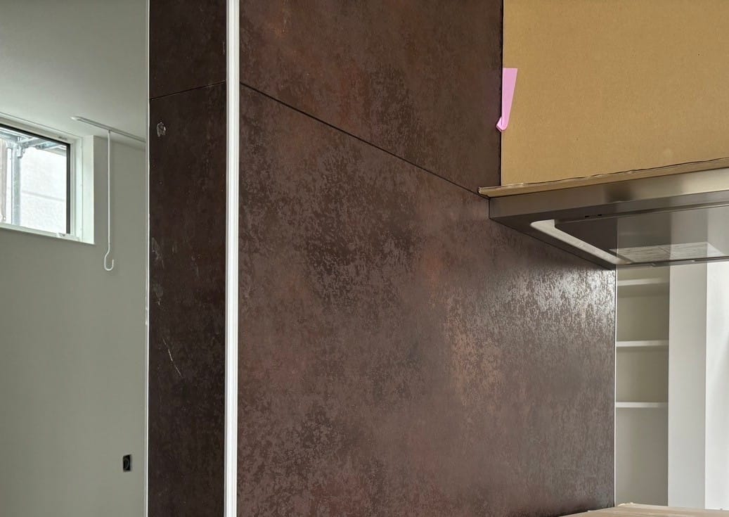 キッチンが設置されました!防護のためにダンボールで囲っていますのでまだ色などはわかりませんが、キッチン横の壁がとてもかっこいいのです。アップにすると…