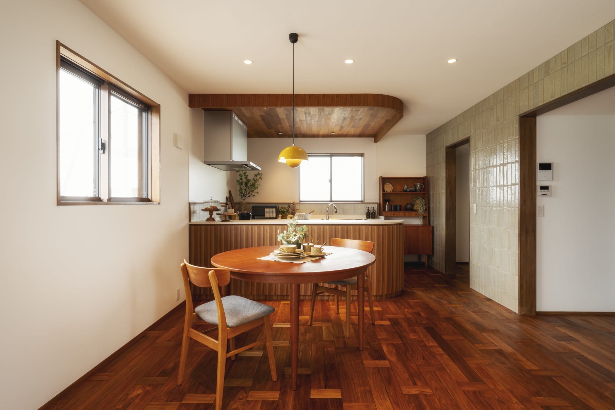 チーク無垢材とアンティーク家具が織りなす特別な空間。壁付けキッチンから南の庭を眺めながら料理を楽しめ、まるでカフェのような心地よい時間が流れます。アンティーク家具が、新築でありながら長年暮らしてきたような温もりを演出します。