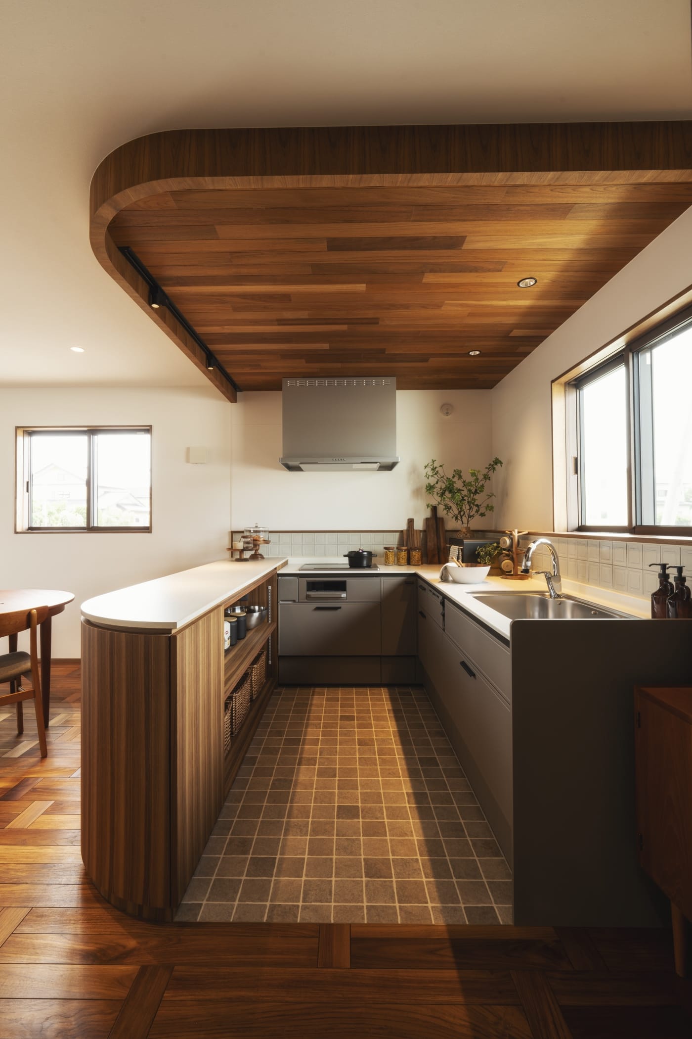 スレート外壁が醸し出す落ち着いた佇まいは、街並みに自然に溶け込む優しい表情。北側斜めの敷地形状を活かした自由な設計は、注文住宅ならではの魅力。リビングから続くタイルデッキで、外でもFIKAタイムを楽しめます。