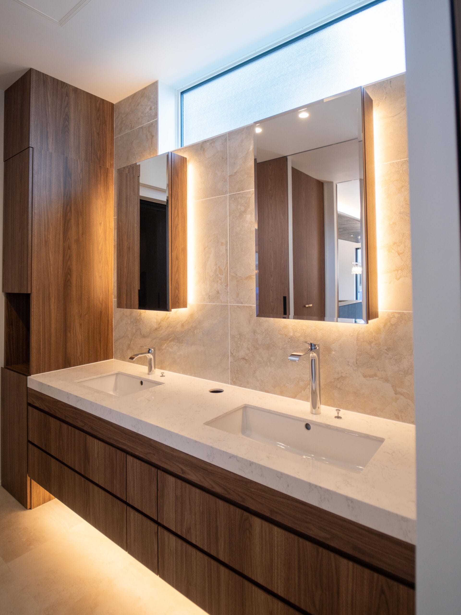 ダブル断熱により、外気の厳しさから家全体をしっかり守りながら、パナソニック「ウイズエアー」の全館空調を導入。リビングだけでなく、脱衣室やトイレに至るまで家中の温度差を解消し、常に快適な環境を保ちます。この確かな温もりが、家族の健やかな暮らしを支えます。