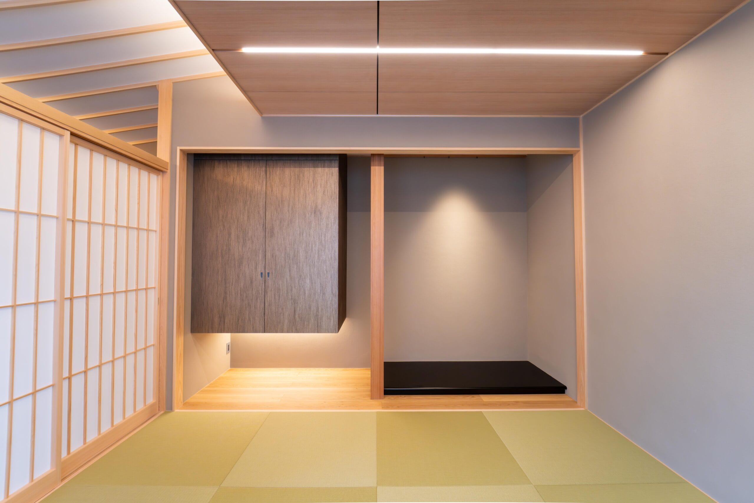 切妻屋根と寄棟が重厚な印象を与える外観デザイン。メインの仕上げは職人の技が光る塗り壁、アクセントに高品質なタイルを組み合わせました。時の経過と共に味わいを増す素材使いが、街並みに溶け込みながらも確かな存在感を放ちます。