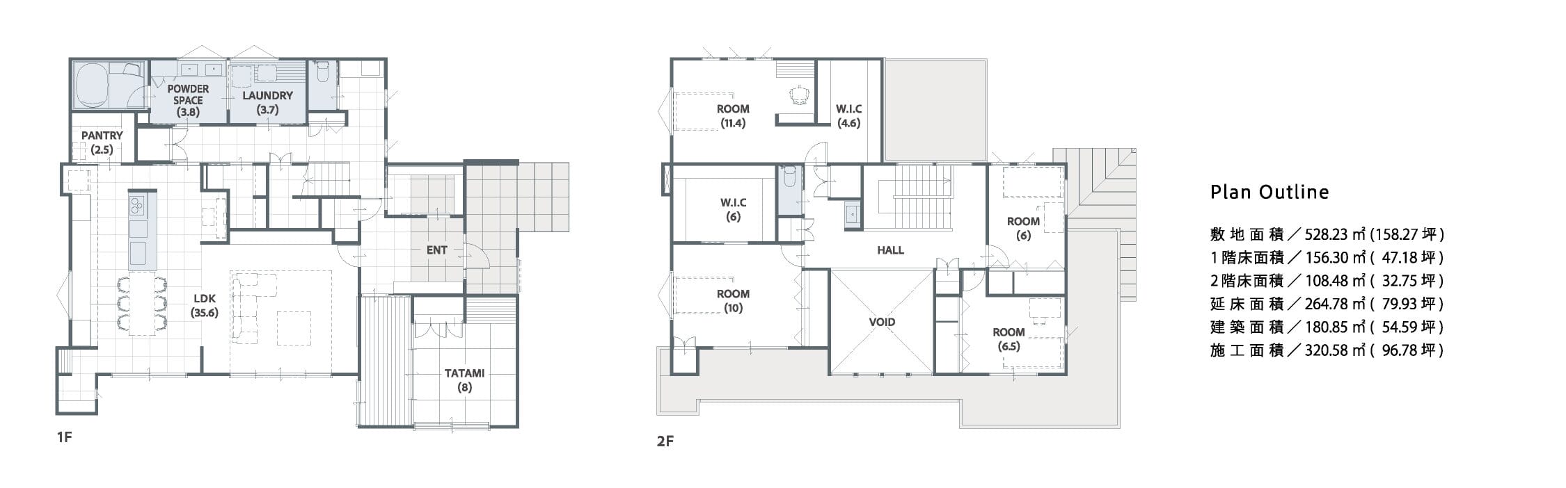 延床面積80坪超のスケールを最大限に活かし、各居室を標準より一周り大きいサイズで設計しました。高い天井高(1F:2700mm, 2F:2600mm)と相まって、実際の広さ以上のゆとりと伸びやかさを感じられます。贅沢な空間が、家族の思い出を刻むための舞台となります。