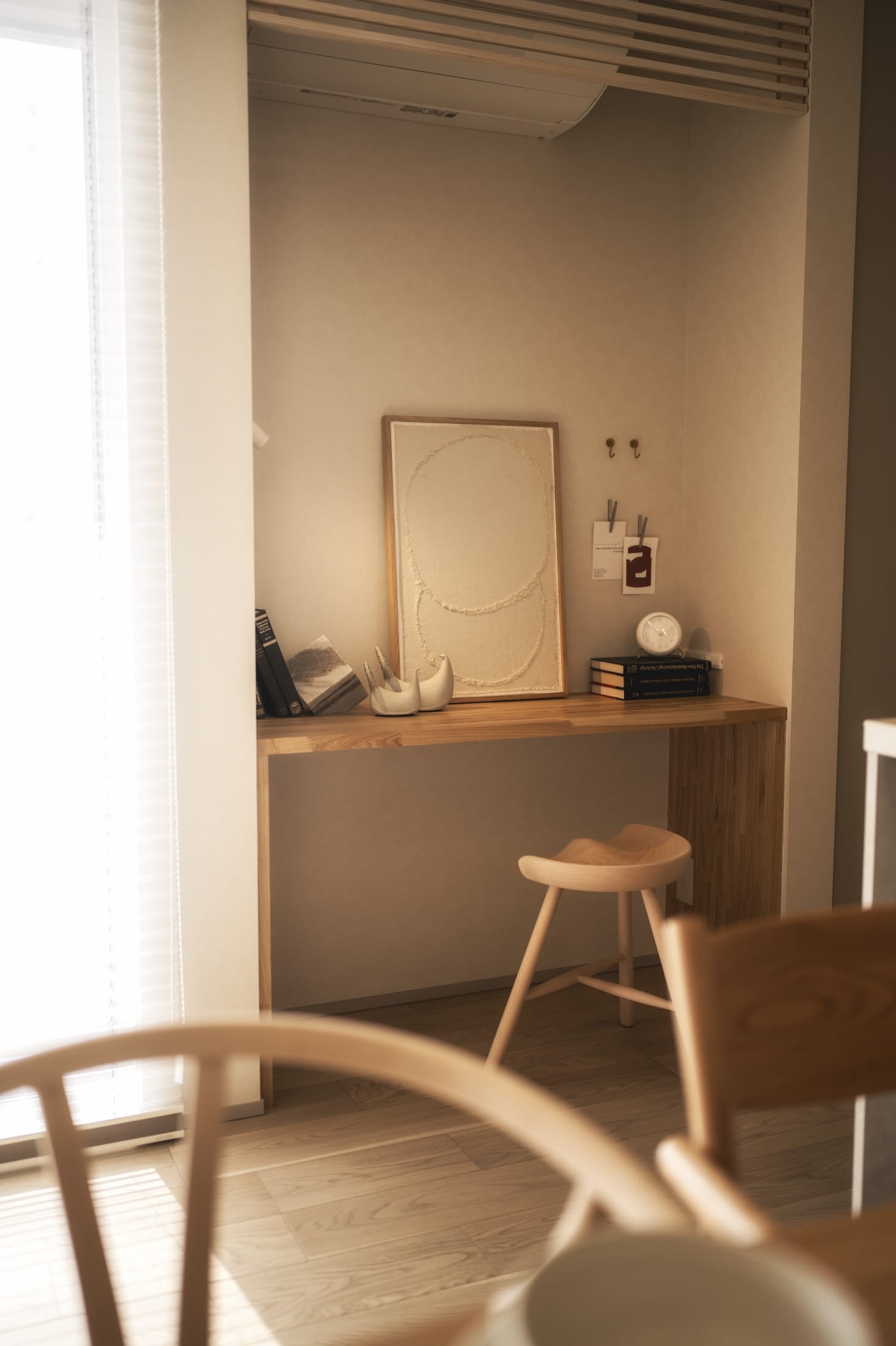キッチン横やリビングの一角には、自分時間を楽しむためのデスクコーナーや、お気に入りのアートを飾るスペースを設えています。機能性だけでなく、ふとした瞬間に心が整う「余白」のデザインが、日々の生活をより豊かで丁寧なものへと変えてくれます。