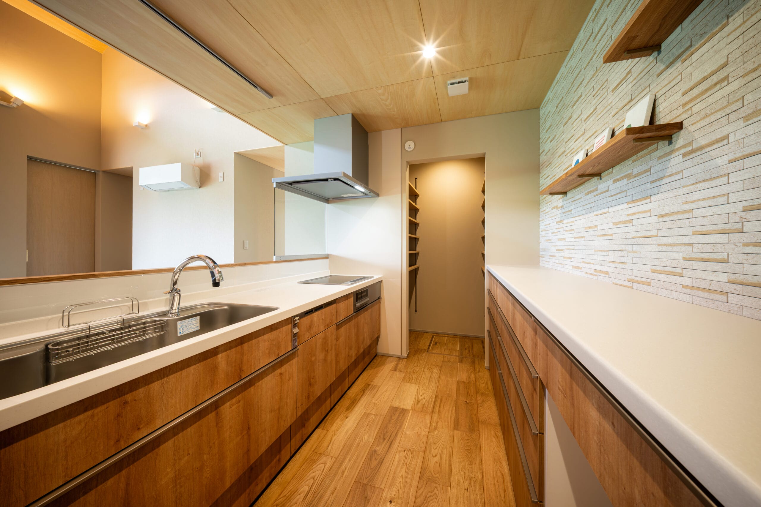 キッチンには木の温もりを感じる板張りの天井を採用し、背面壁には質感豊かなアクセントタイルを施すことで、カフェのような落ち着きある意匠を凝らしました。また、キッチンから直接アクセスできる大容量のパントリーを配置。デザイン性だけでなく、日々の家事効率を劇的に高める機能的な動線設計により、美しく整った暮らしをサポートします。