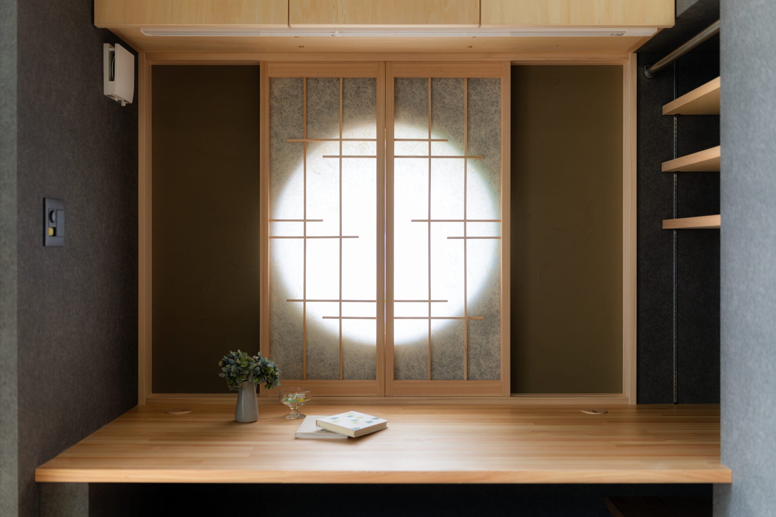 LDKには吹抜けを設け、縦方向への広がりを感じる開放的な空間を実現。リビングの隣には、美しい中庭を眺められる和室コーナーを配置しました。「丸窓」から切り取られた庭園の景色は、日々の暮らしに安らぎと季節の彩りを添え、家族で落ち着いた時間を過ごせる特等席になります。