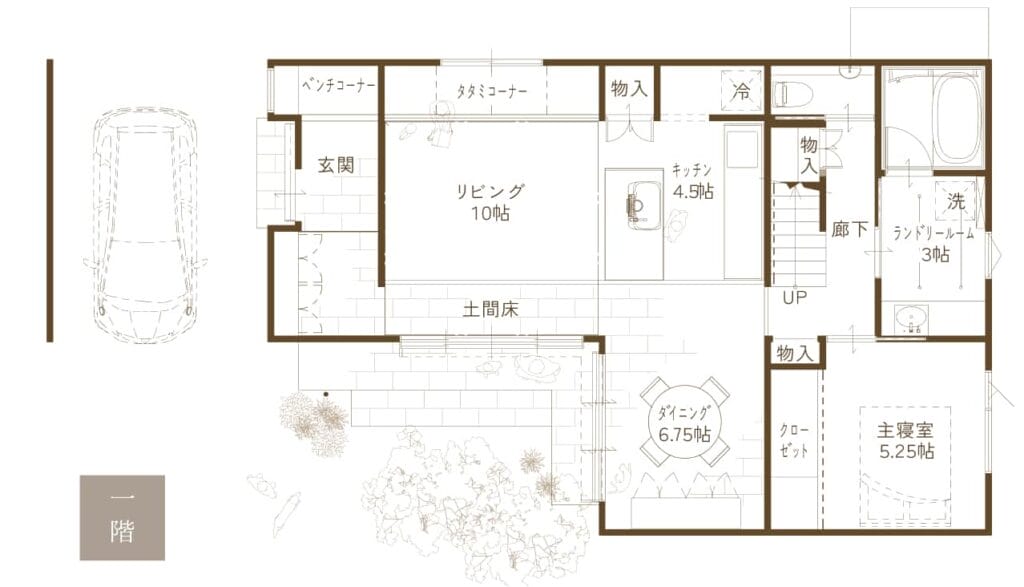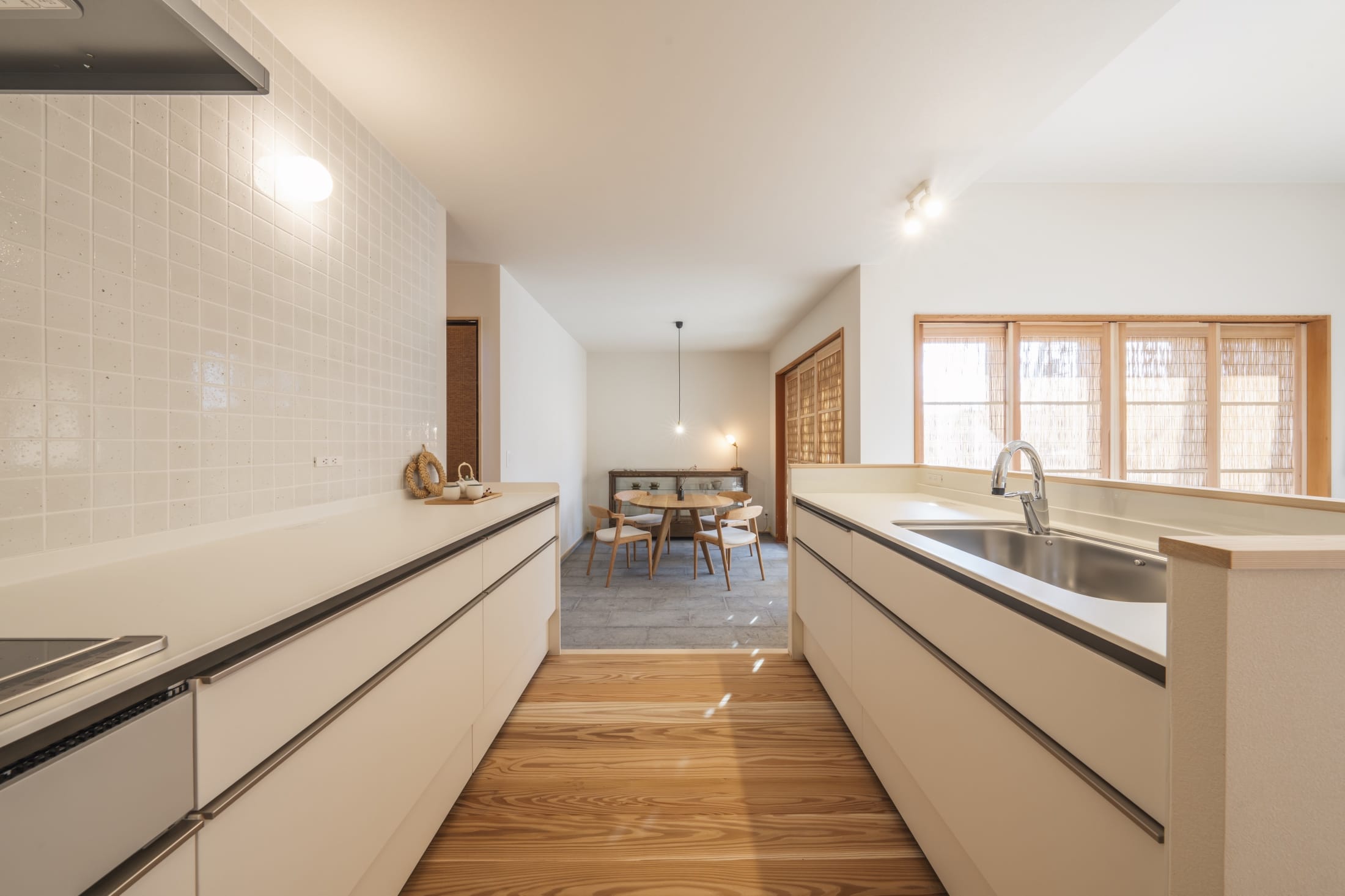 タイルデッキ、外壁塗りかべ、石床の土間ダイニング、木製サッシ、簀戸
